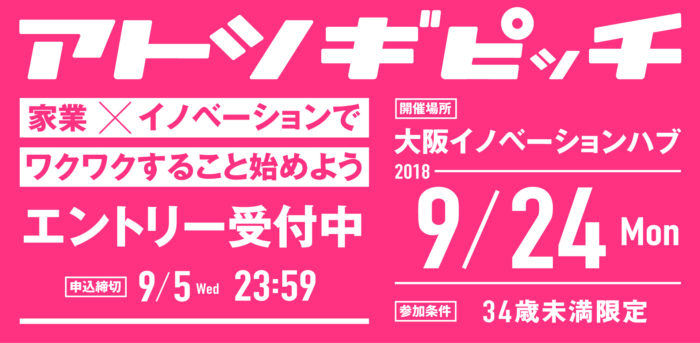本イベントは、スタートアップを対象にしたビジネスプランコンテストと異なり、新規性、独自性、市場性などに加え、家業がもつ有形無形の経営資源を活かしているかどうか?も重要な審査基準となっているのが特長です。 自身の家業を活用した事業プランを発表したい34歳未満のアトツギであれば、全国から参加が可能。 事務局による書類選考に勝ち残った10人が、事前のメンタリングをそれぞれうけたのち、ファイナリストとして登壇し、ビジネスアイディアを競います。 さらに、アトツギピッチにさきがけ、8月31日(金)~9月2日(日)の3日間連続で、家業の経営資源を活用した新たなビジネスアイディアを“チームで”競い合うアイデアソン、「アトツギソン」(詳細:http://atotugithon2018s.peatix.com)も開催。これから家業と向き合うアトツギがワクワクできる視点や同世代の仲間からの刺激を受けられるイベントになっています。 34歳未満の家業があるアトツギであれば、まだ継いでなくても継ぐことを決めてなくてもOK!アイディアを自分だけで終わらせず、実現をさせるための第一歩として本イベントに挑戦しませんか?面白いアイディアをぶつけてくれるアトツギの応募、お待ちしています!日時